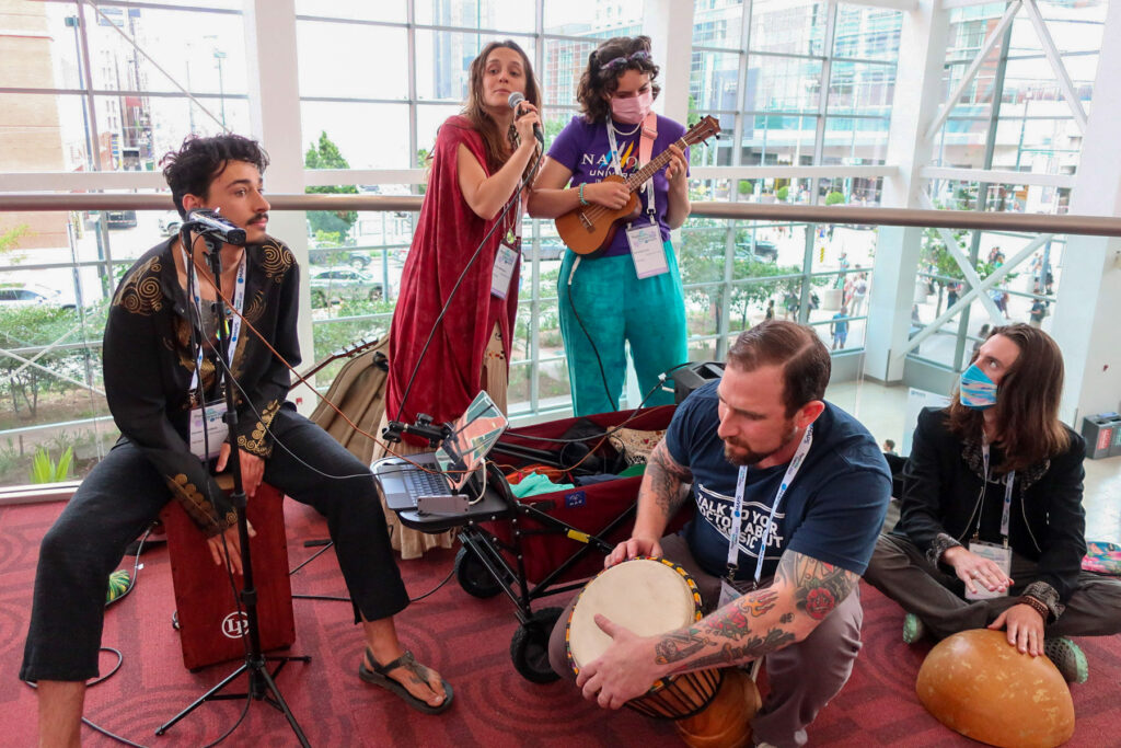 Jenna McMurtry/CPR NewsAn expo marketplace inside the Denver Convention Center featured various products and experiences related to the psychedelic movement and community including retreat opportunities, treatments, self-care and swag.Jenna McMurtry/CPR NewsMusicians filled the main lobby of the Denver Convention Center for the 4th Psychedelics Science Conference.