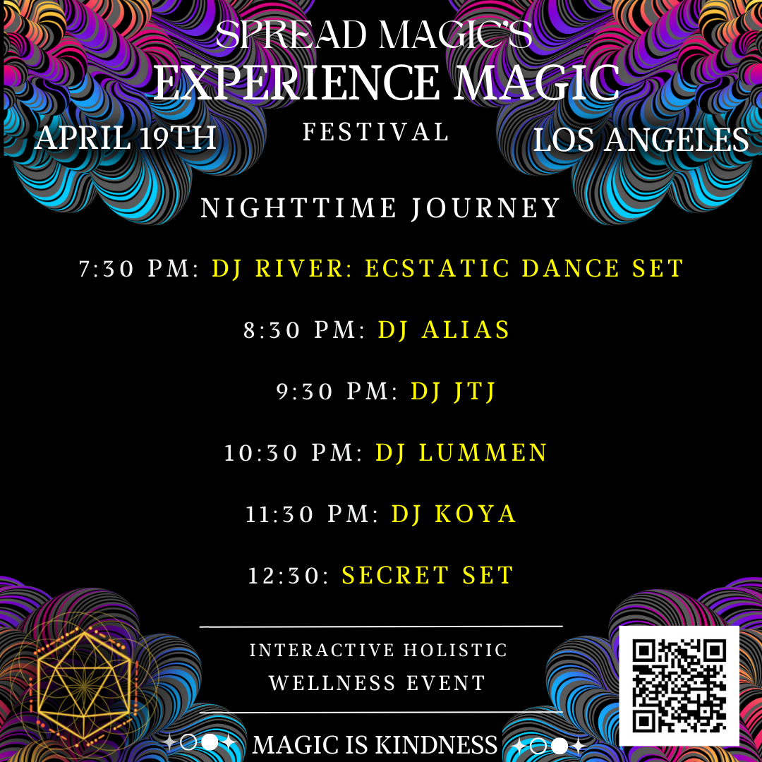 The Experience Magic Festival will occur from 2 pm – 12 am on April 19, 2023, in Koreatown, LA, California. Our event is all about providing a haven where guests can dance freely, communicate without fear of judgment, and explore their inner worlds. We prioritize harm reduction, education, and empowerment through holistic workshops, chill vibes, and interactive space. And you know, we love EDM music. So our goal is to create an environment where our guests can experience magic in a safe and welcoming space amidst inviting electronic music.